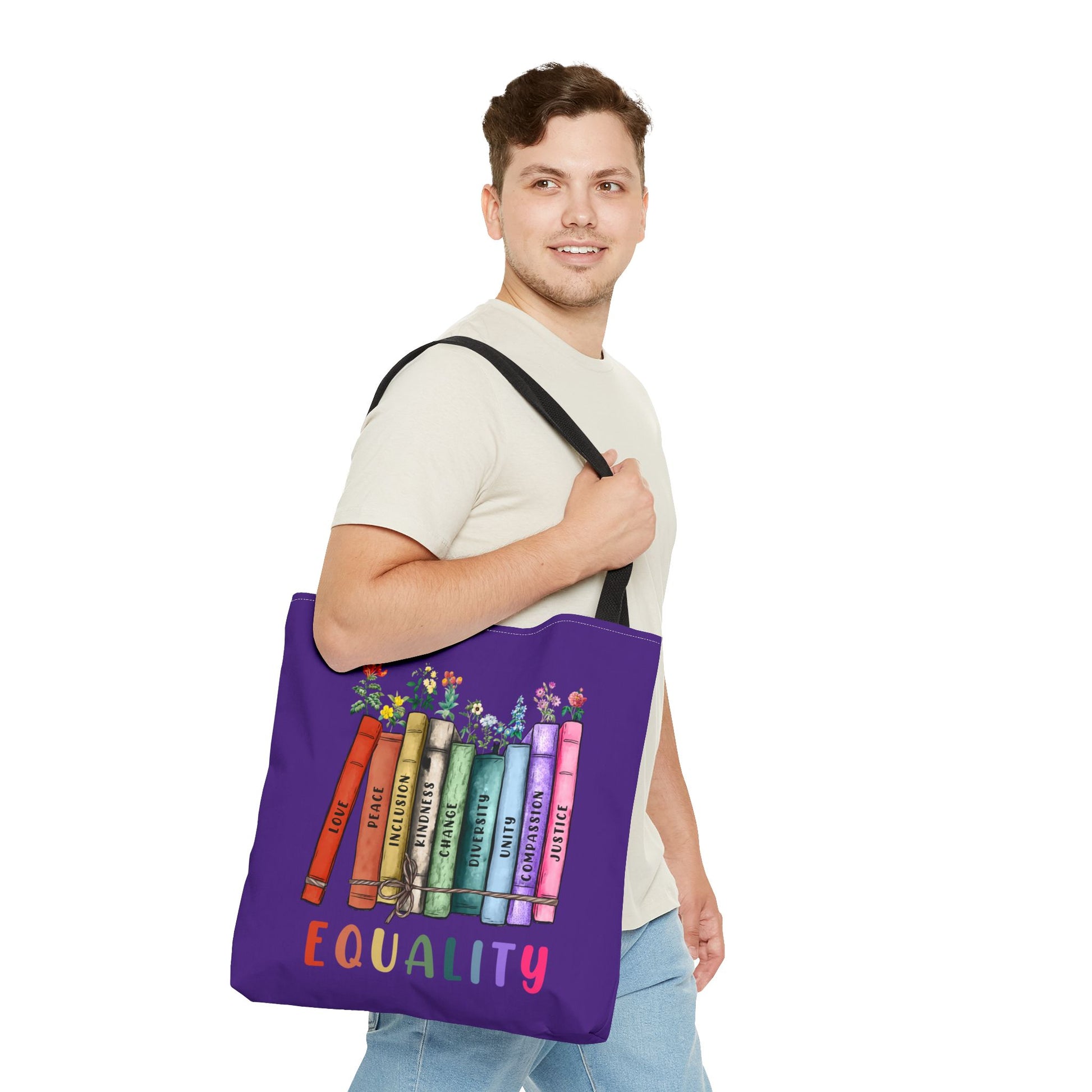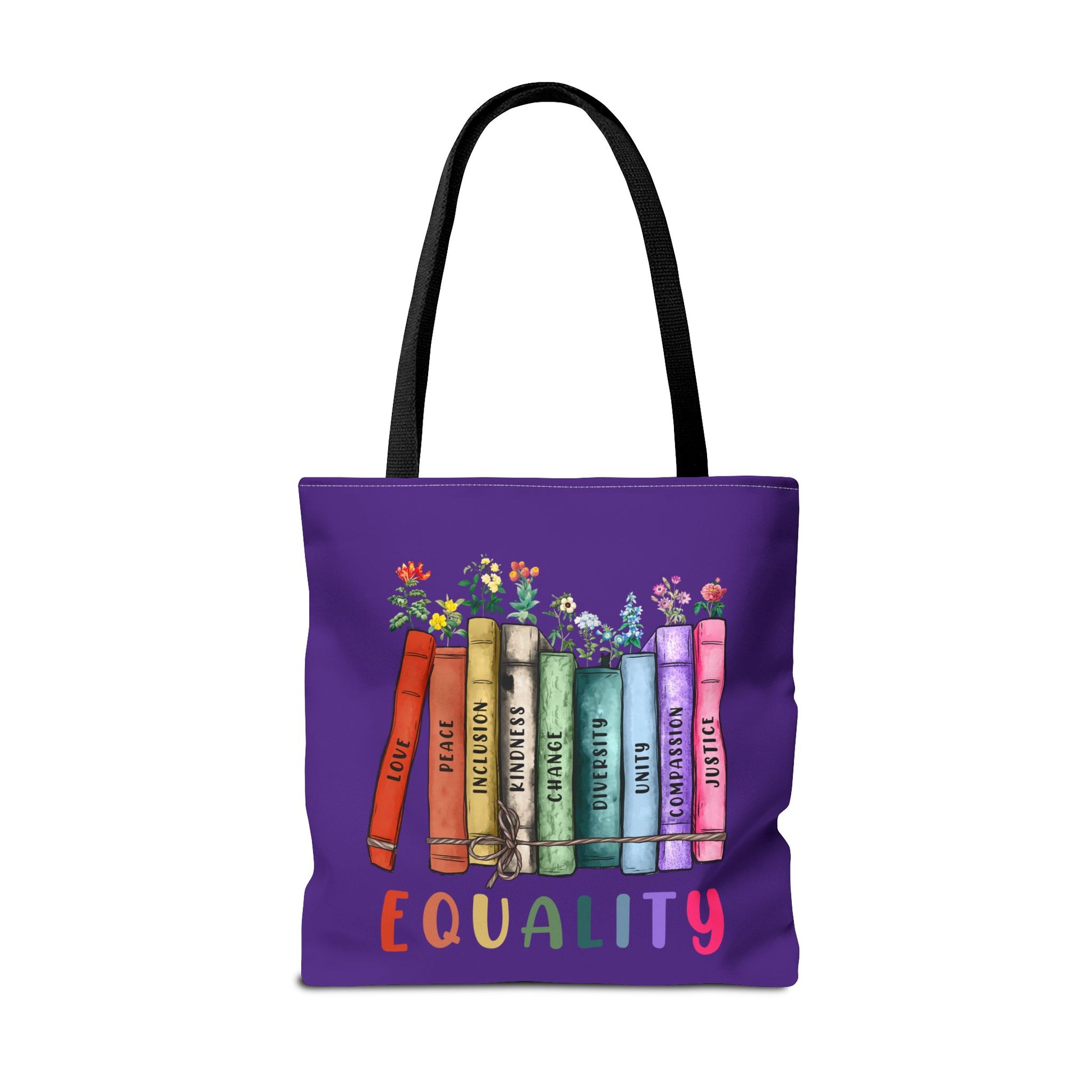 Books build empathy—and this tote says it loud and proud. Featuring a purple background, bold “Equality” bookstack design with floral accents, and sturdy black handles, this bag is a beautiful celebration of inclusion, representation, and love in all forms.