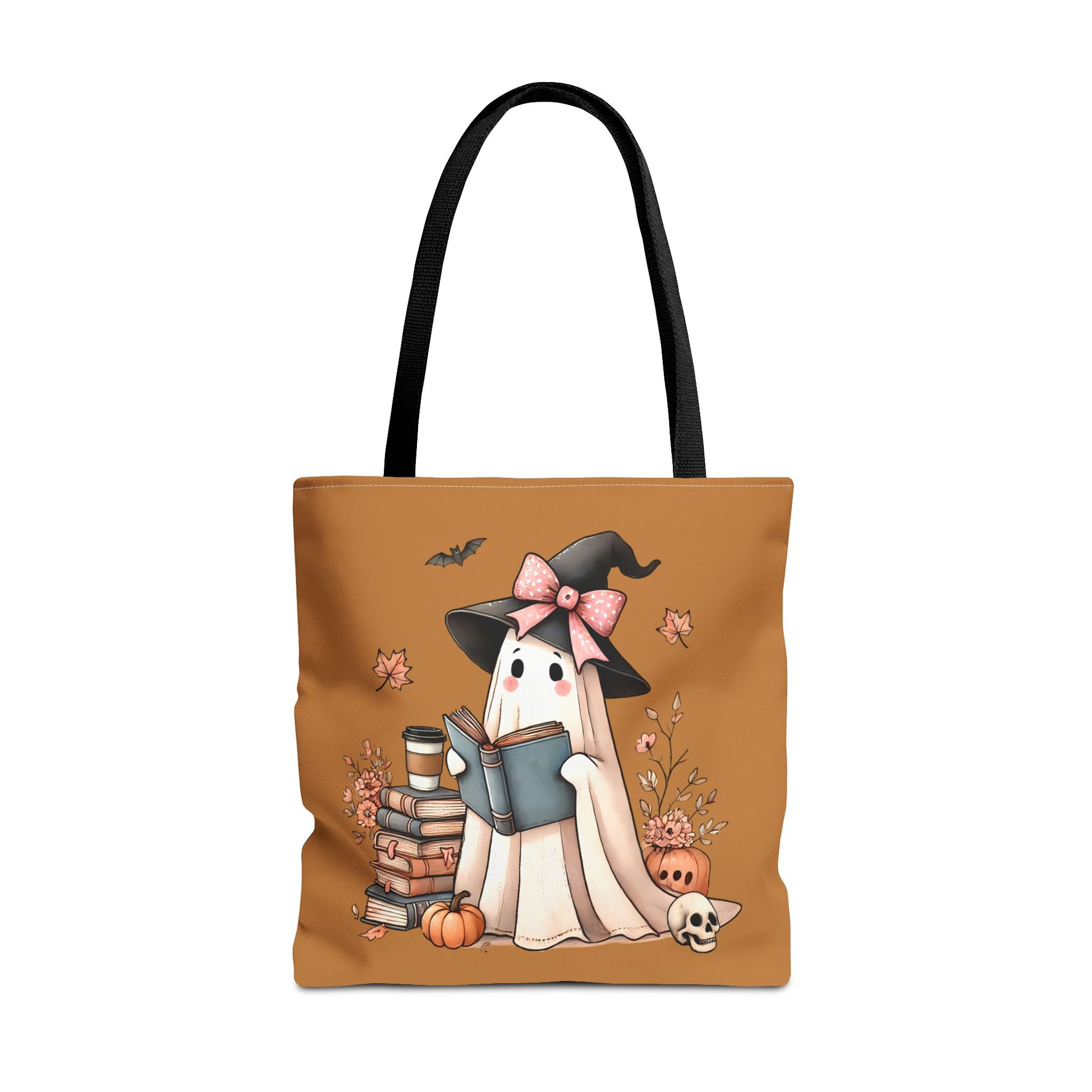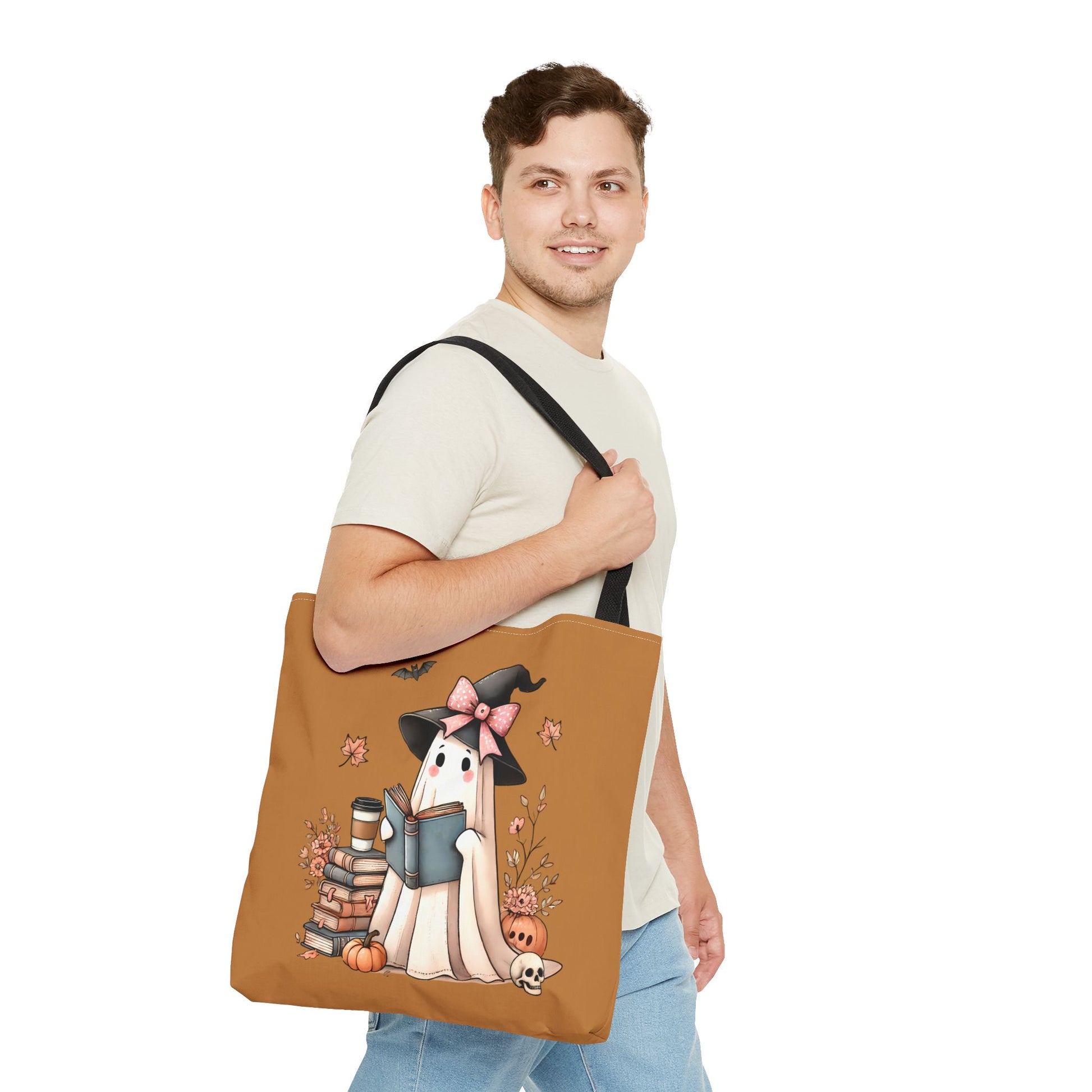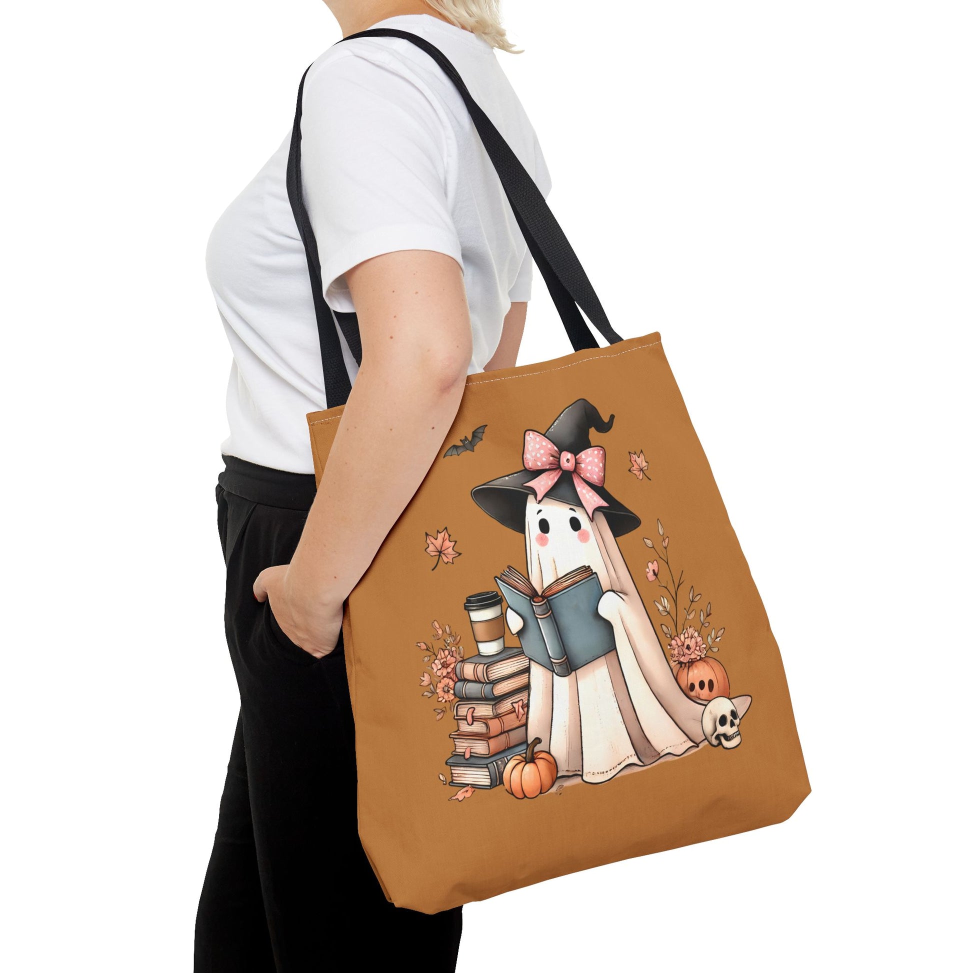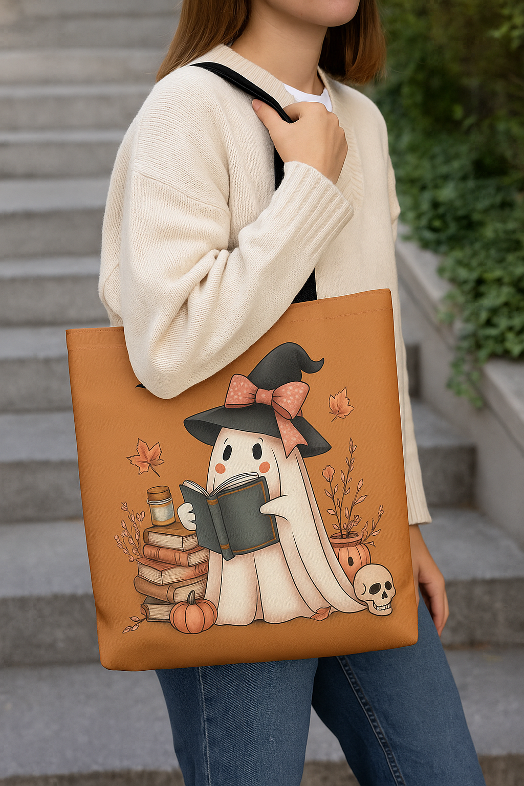 Carry a little spooky charm everywhere you go! This roomy 18x18 tote features a ghost in a witch hat reading beside a stack of books β the perfect blend of Halloween vibes and bookish style. Great for hauling your latest reads, grocery runs, or trips to your favorite local market.
