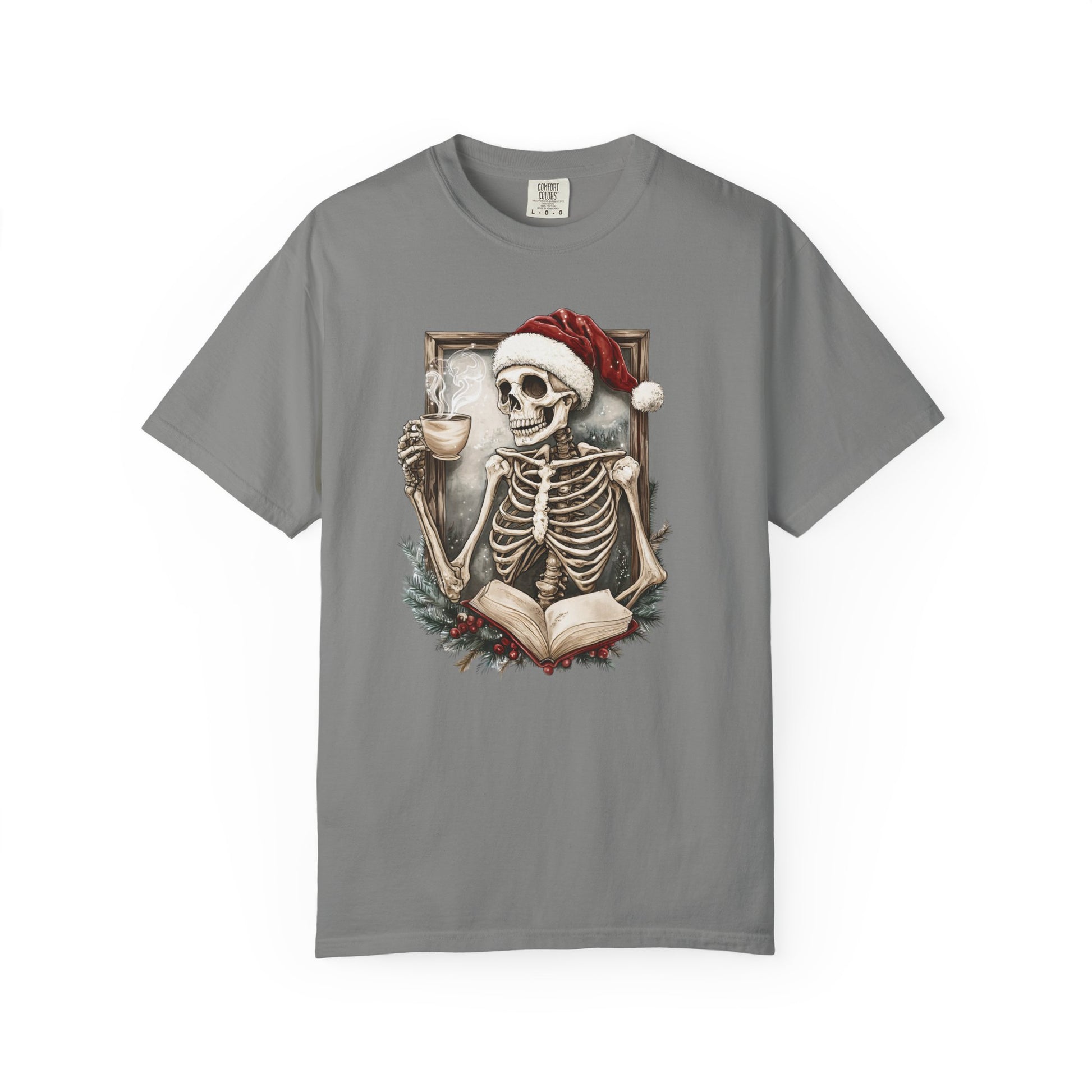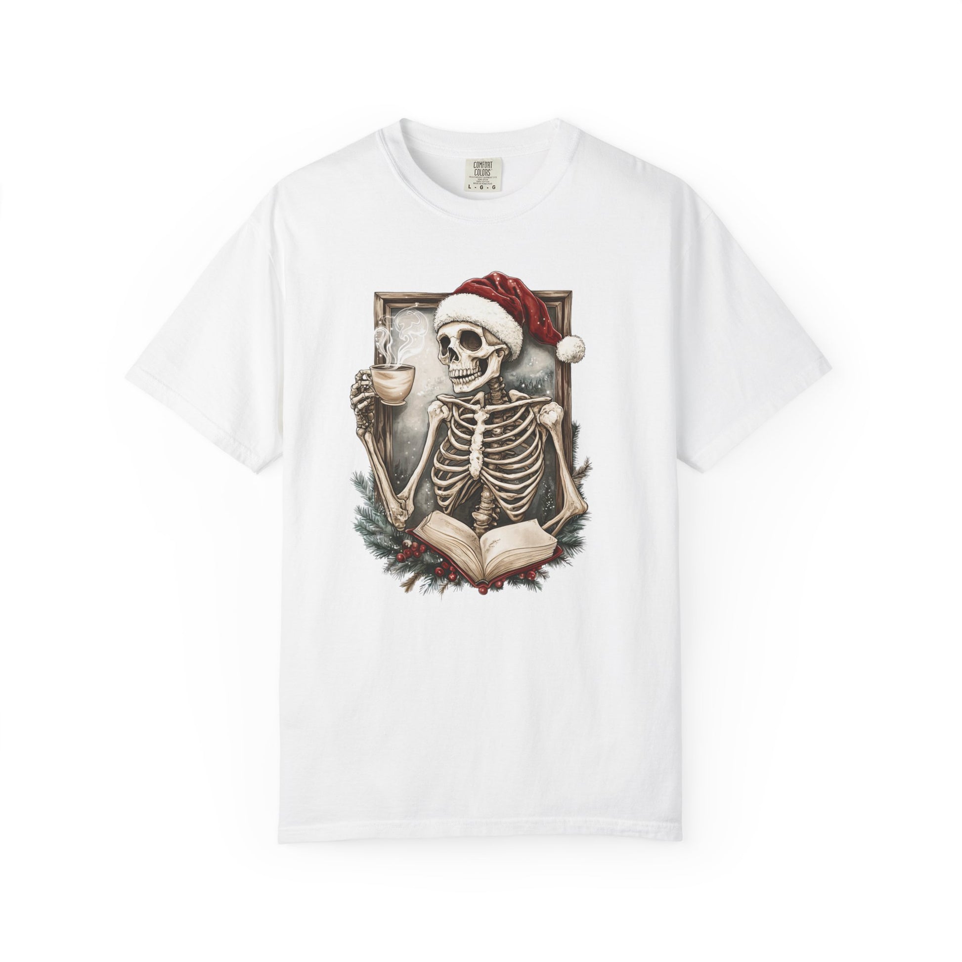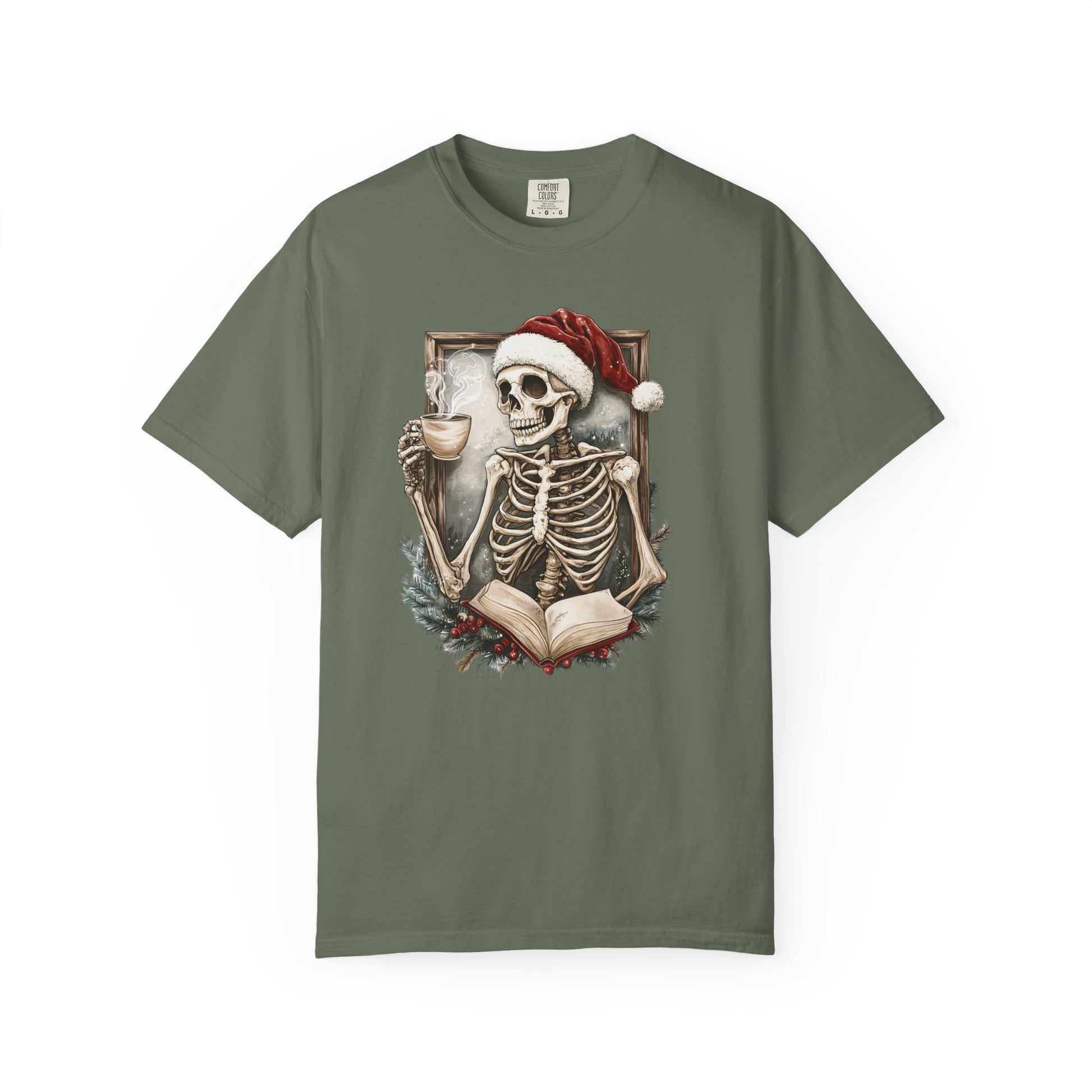 Cozy up this holiday season with the perfect mix of spooky and festive! This Comfort Colors tee features a skeleton in a Santa hat, sipping coffee and reading—a must-have for book lovers who like their Christmas a little different.